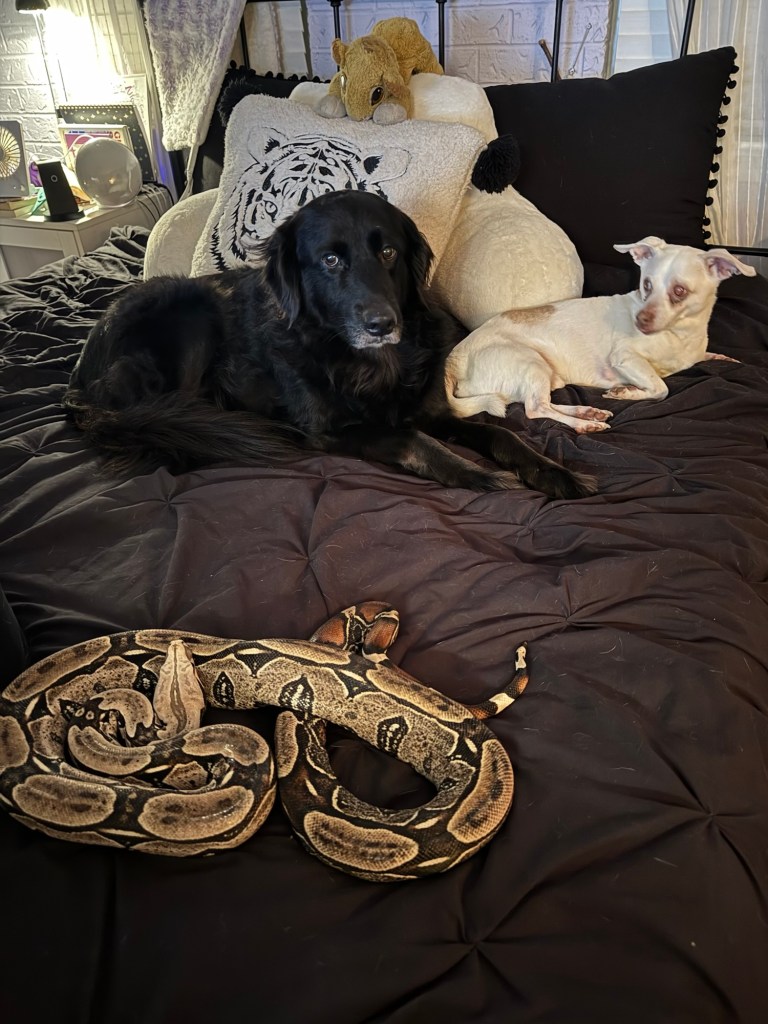 I never planned on owning a pet snake, but now I can’t imagine my life without him. A lot of people don’t understand loving reptiles, but I promise the connection I have with Kaa is just as meaningful as the connections I’ve had with my dogs and cats. He knows I’m his mama, and he knows my other pets are his siblings. He is happy to be held by other people but prefers to be able to see me for a sense of security. He snuggles with me and expresses affection with little kisses and squeezes and snorts. He fascinates, entertains, and comforts me.